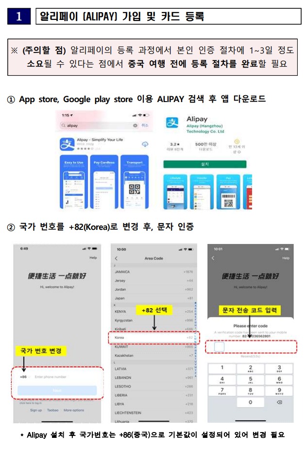 - 국가 번호를 +82(Korea)로 변경 후, 문자 인증 (* Alipay 설치 후 국가번호는 +86(중국)으로 기본값이 설정되어 있어 변경 필요)