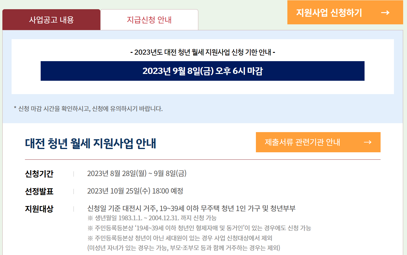 - 2023년 대전 청년 월세 지원사업 신청 기한 -